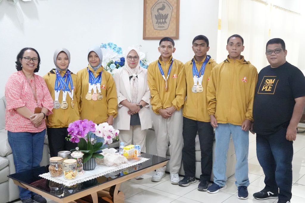 Kontingen yang pulang dar Surabaya langsung kase medali secara simbolis par Wakil Rektor Bidang Kemahasiswaan, Hubungan Masyarakat, dan Alumni Universitas Pattimura Dr. Nur Aida Kubangun S.Pd., M.Pd., di Ruang Kerja Wakil Rektor III Universitas Pattimura, Jumat (13/2/2026).
