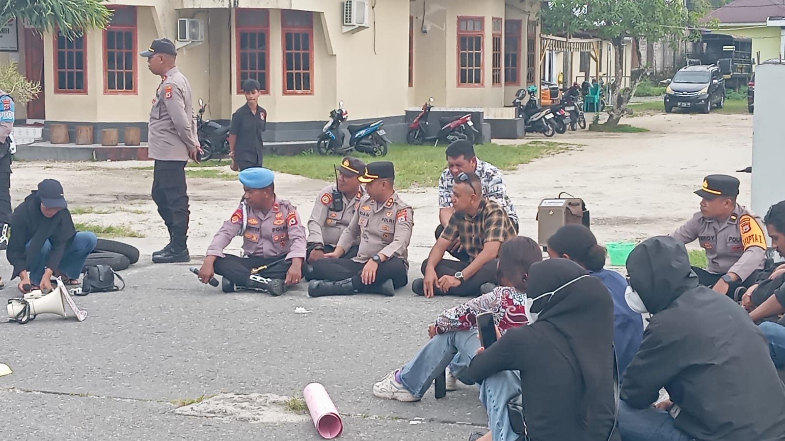 Mananggapi aksi itu, Kapolres Malra AKBP Rian Suhendi akhirnya kaluar tongka massa dan tarima dong pung aspirasi sambil dudu-dudu sama-sama di muka Mapolres.