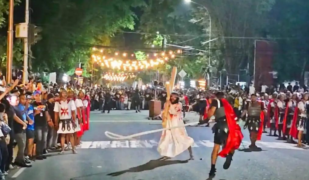 Salaeng pawe obor, suasana religius juga dapa rasa paleng kuat di sapanjang Jalan Pattimura, Kecamatan Sirimau. Ribu-ribu warga biking padat kiri-kanang jalang par lia drama prosesi panyaliban Yesus Kristus, yang Jemaat GPM Syaloom Batu Meja Ambon biking akang. Dong kolaborasi deng Paduan Suara Ora Et Labora.